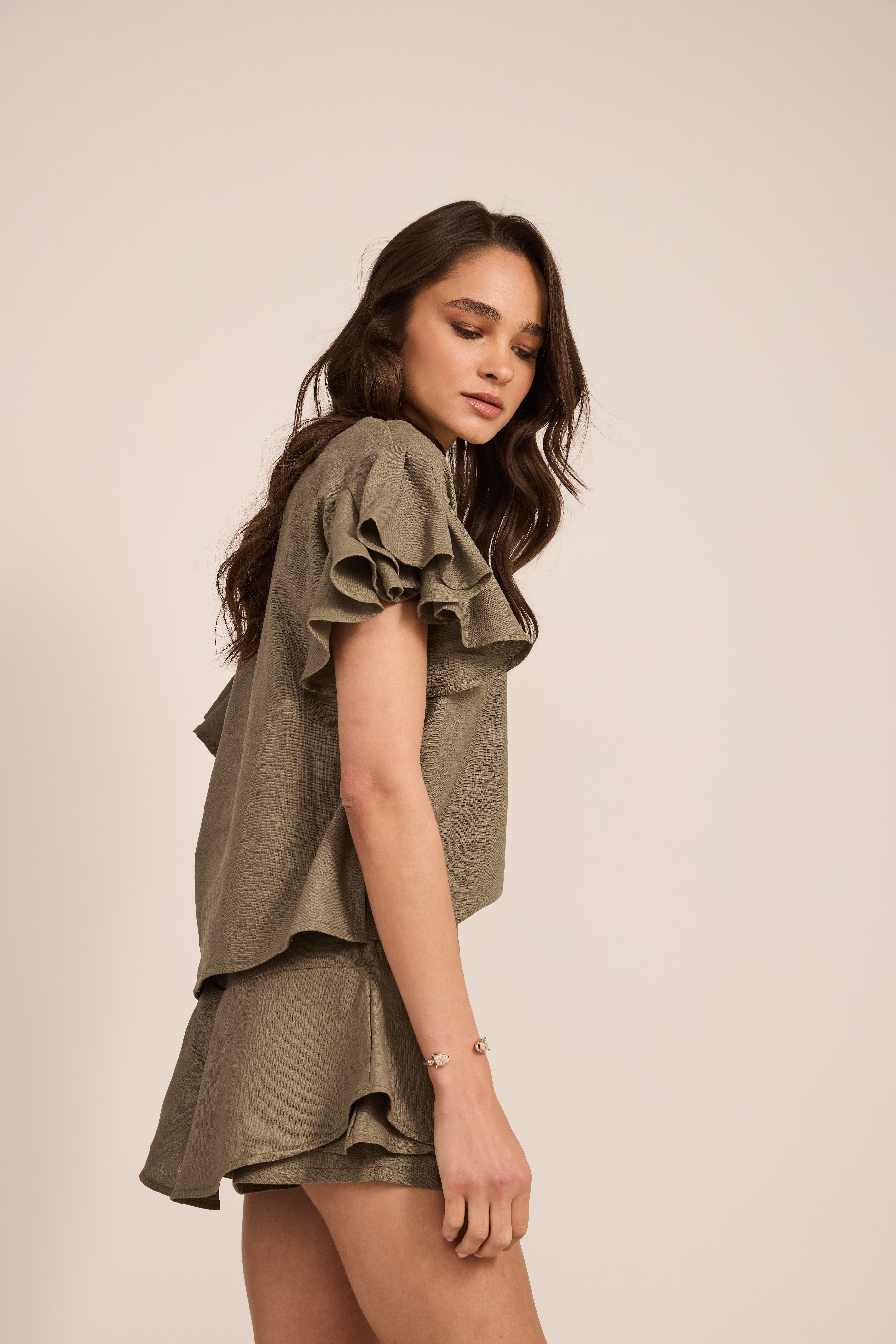 Short de lino tiro medio con doble vuelo y cierre invisible al costado.
