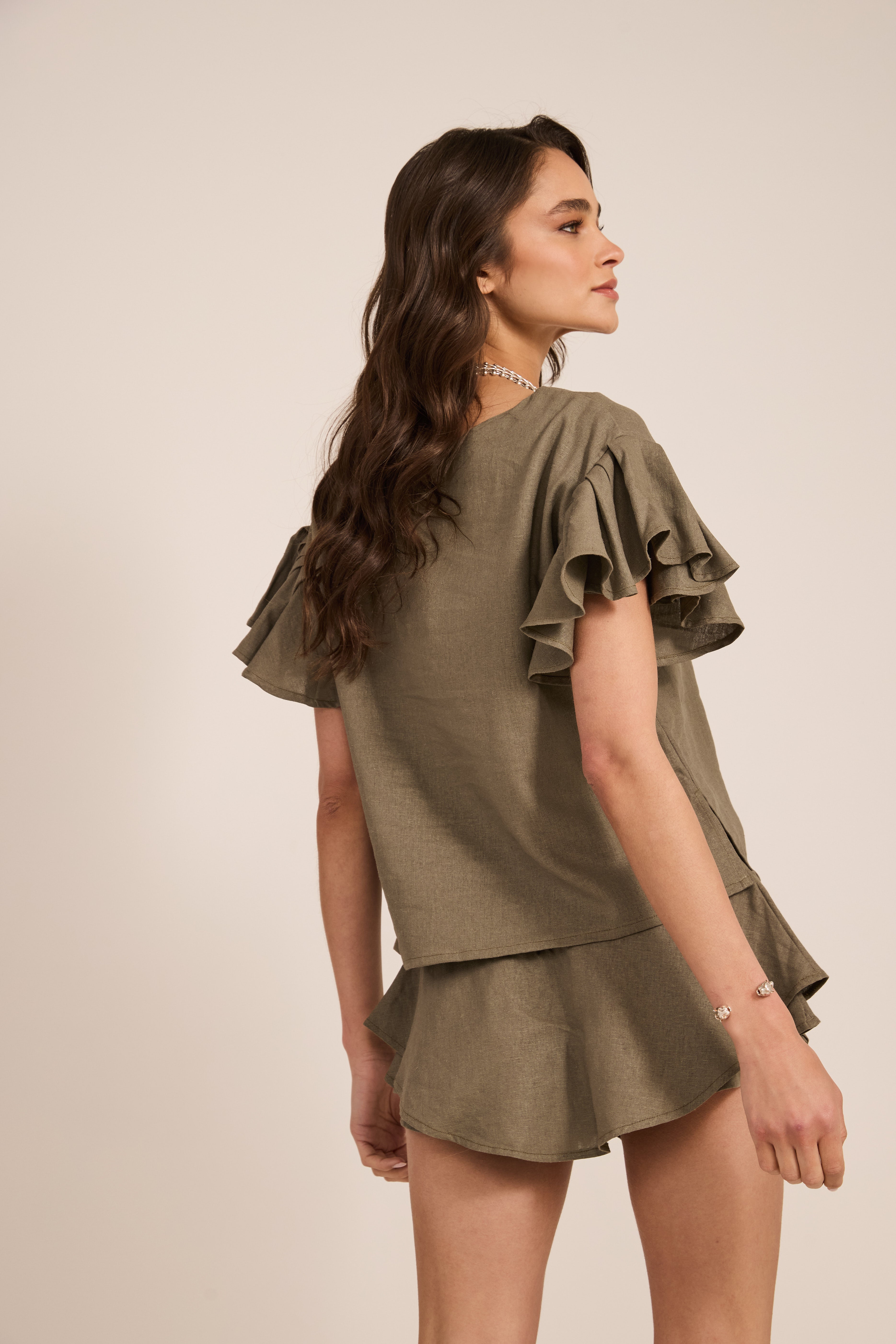 Top de lino con cuello redondo y manga con doble vuelo.