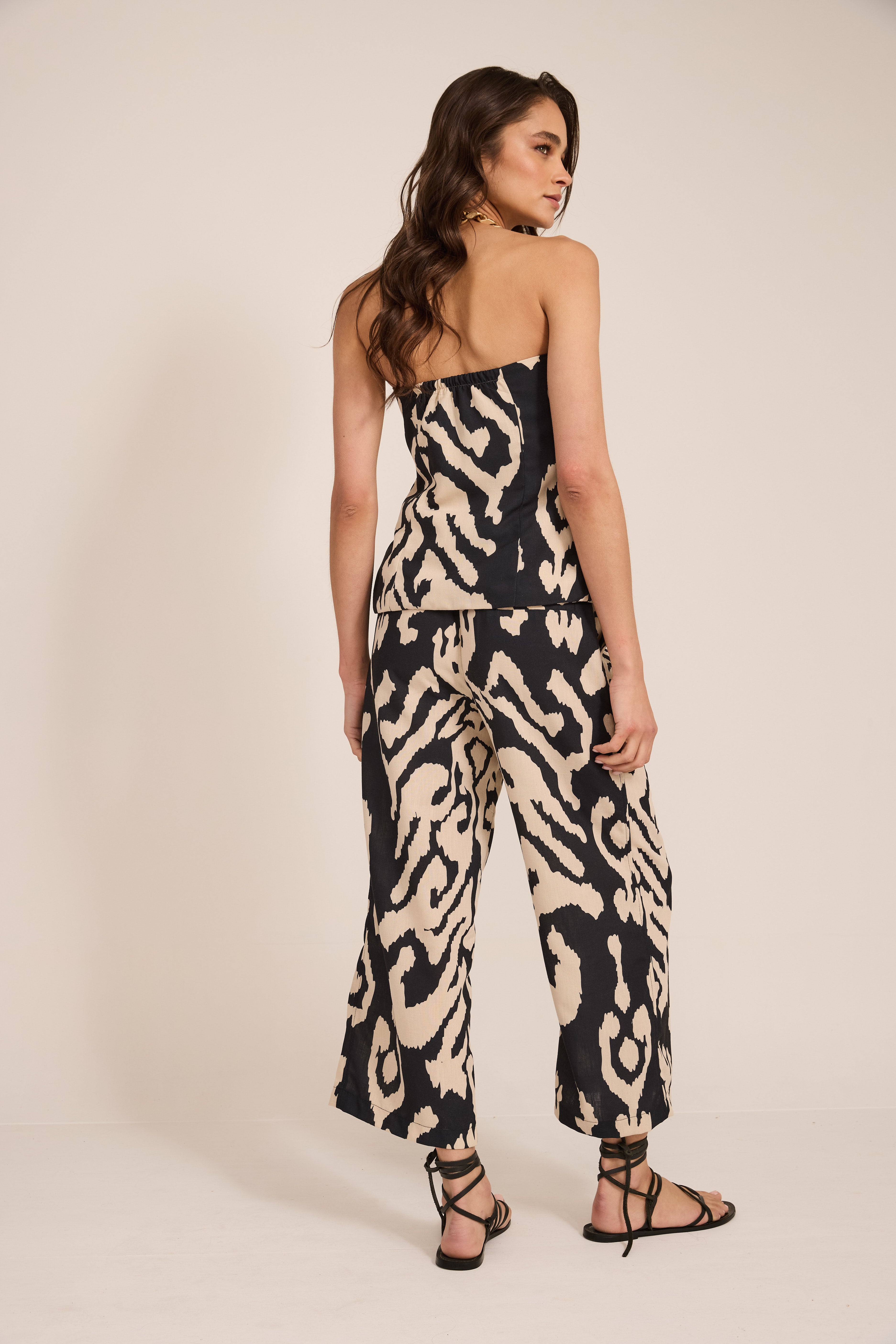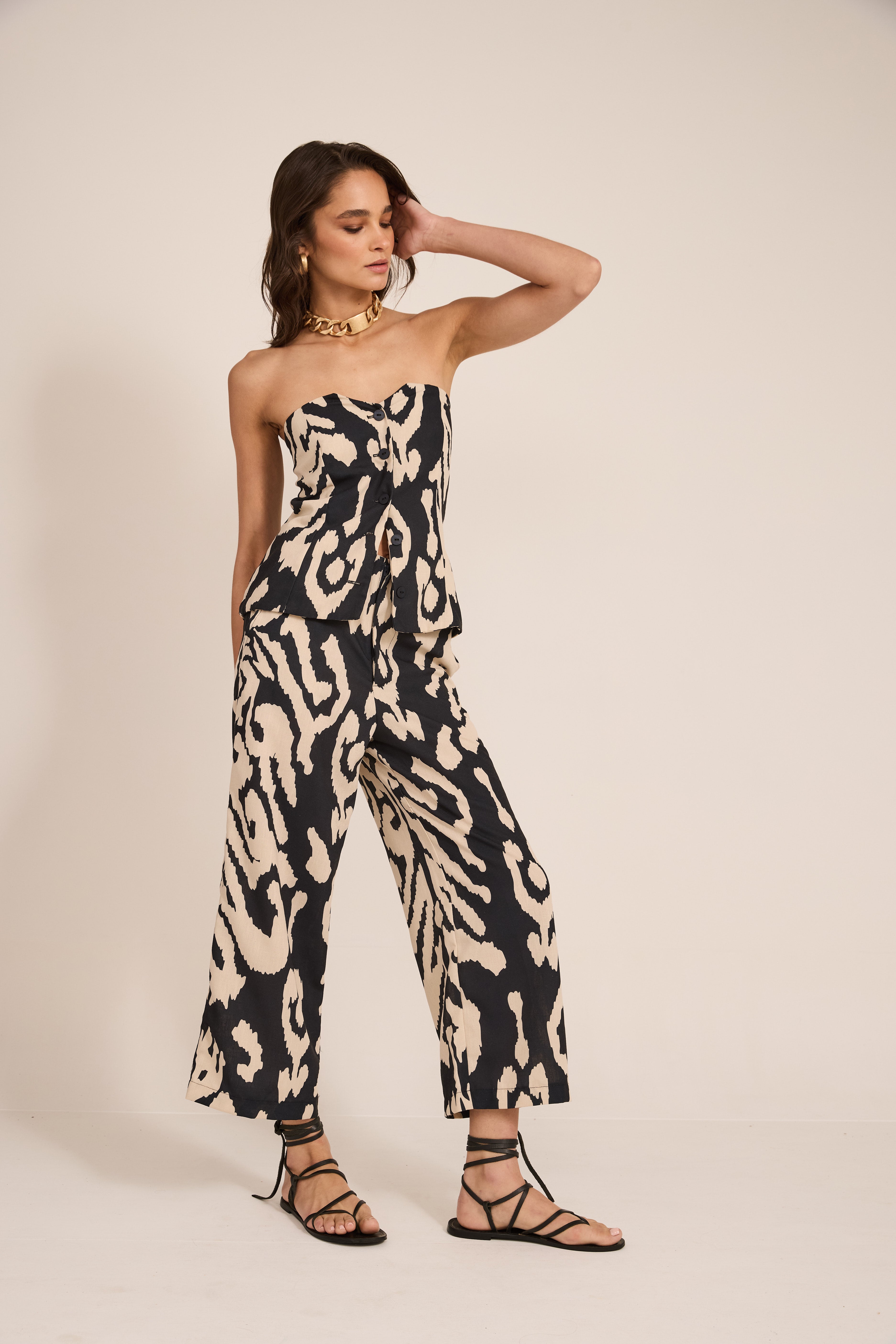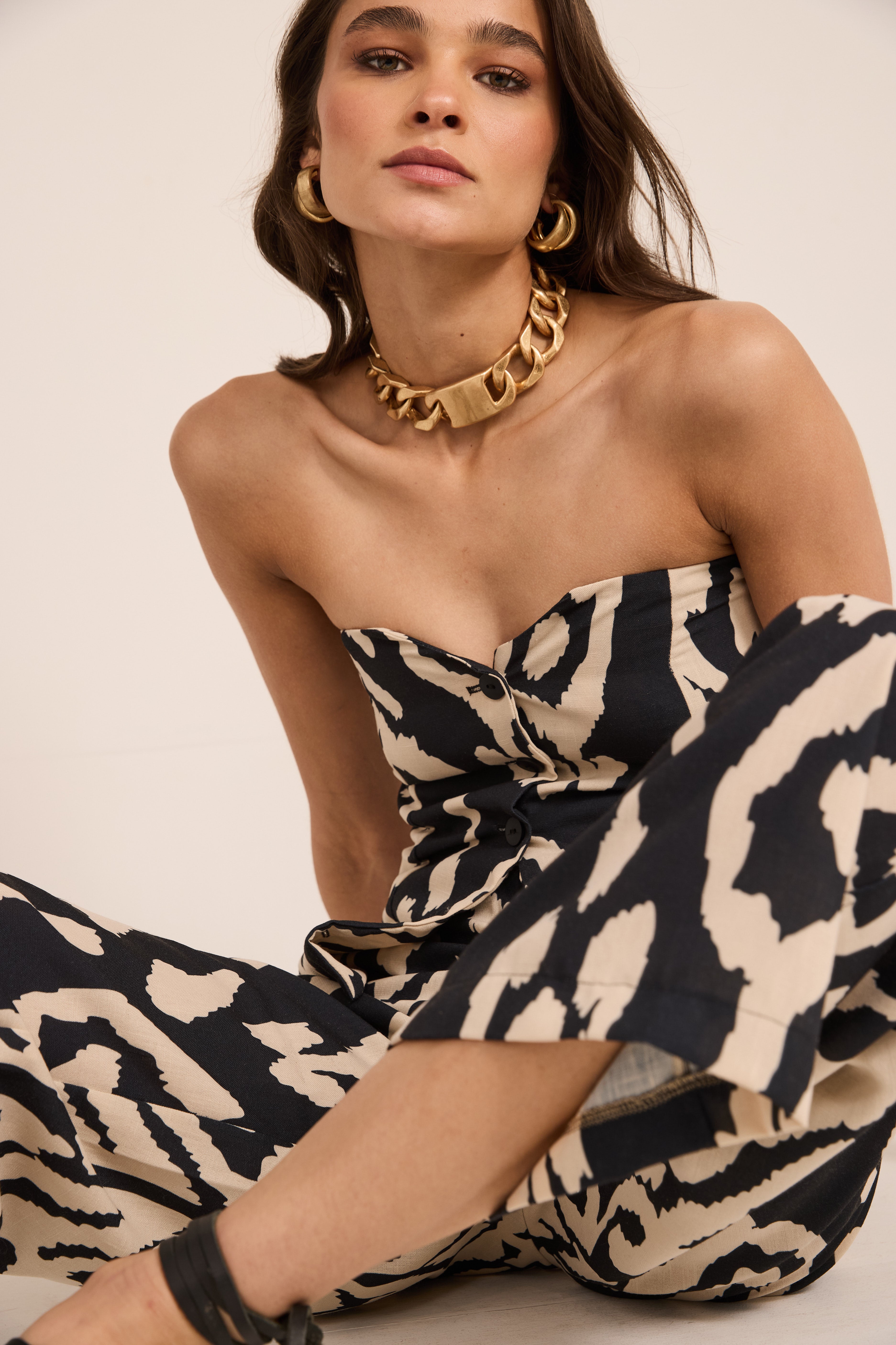 Gillette de lino estampado con escote strapless y cierre frontal con botones.