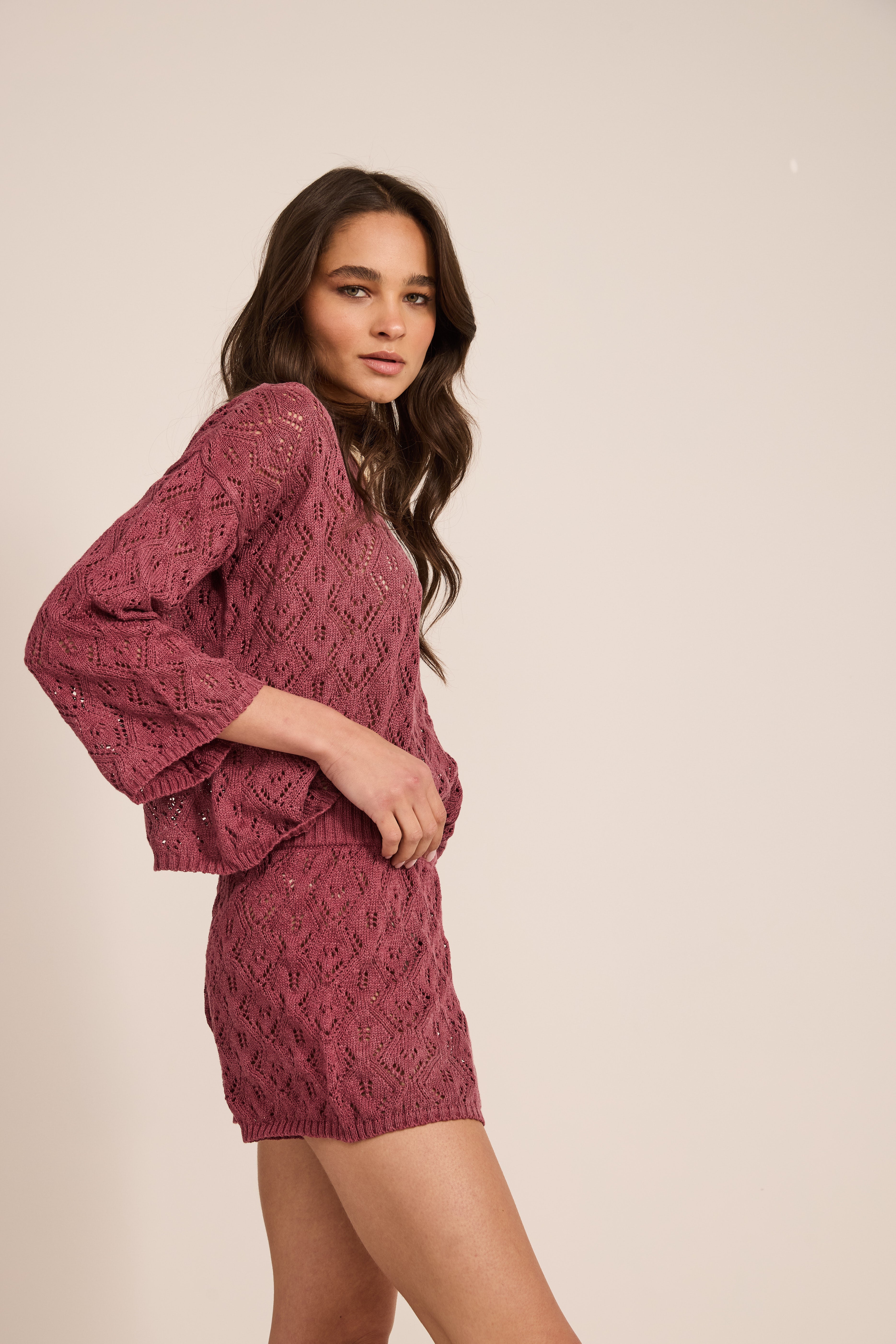 Top de punto con manga larga y short de punto corto con pretina de elástico.