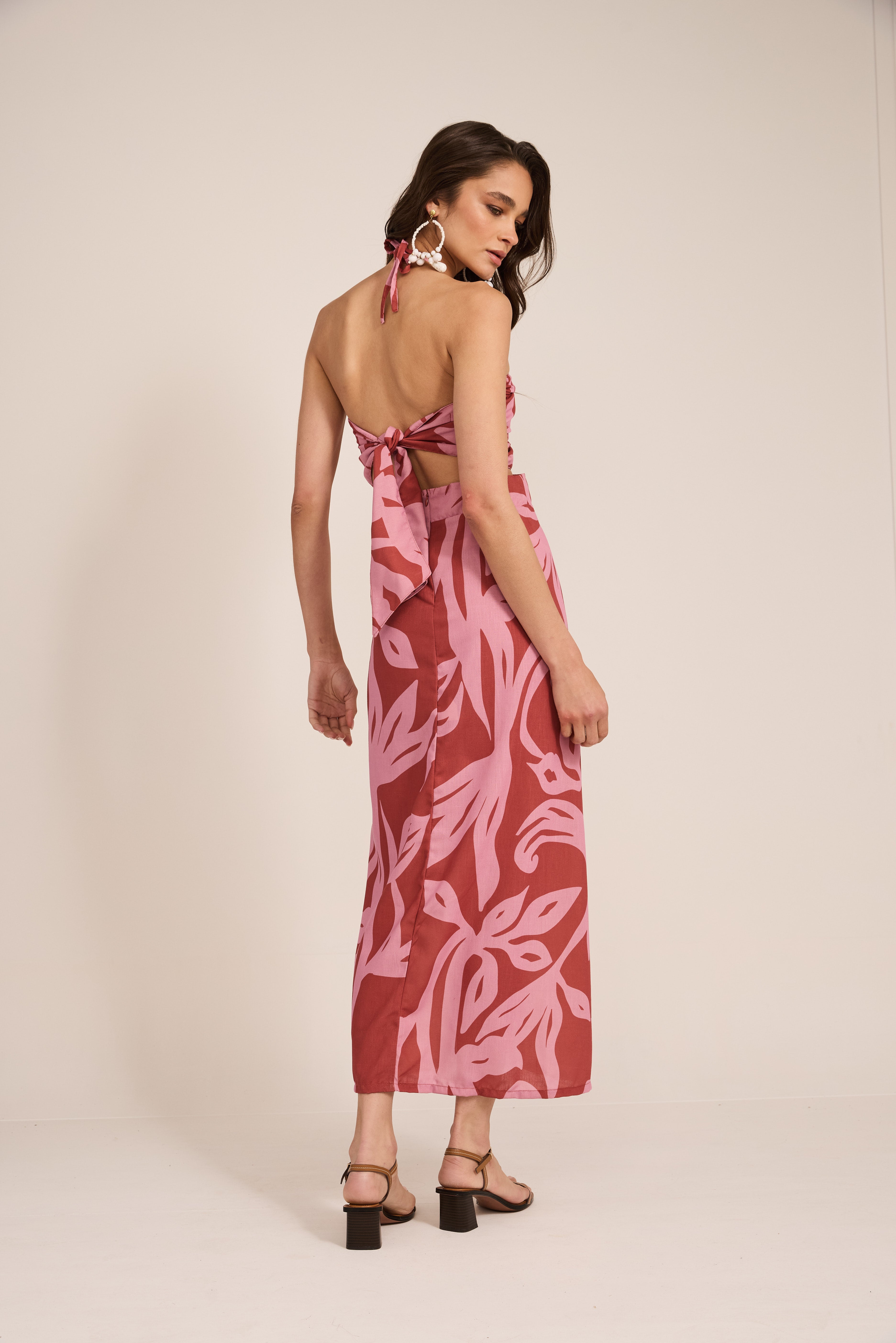 Escote strapless con fruncido al medio y tirantes delgados amarrados en el cuello.