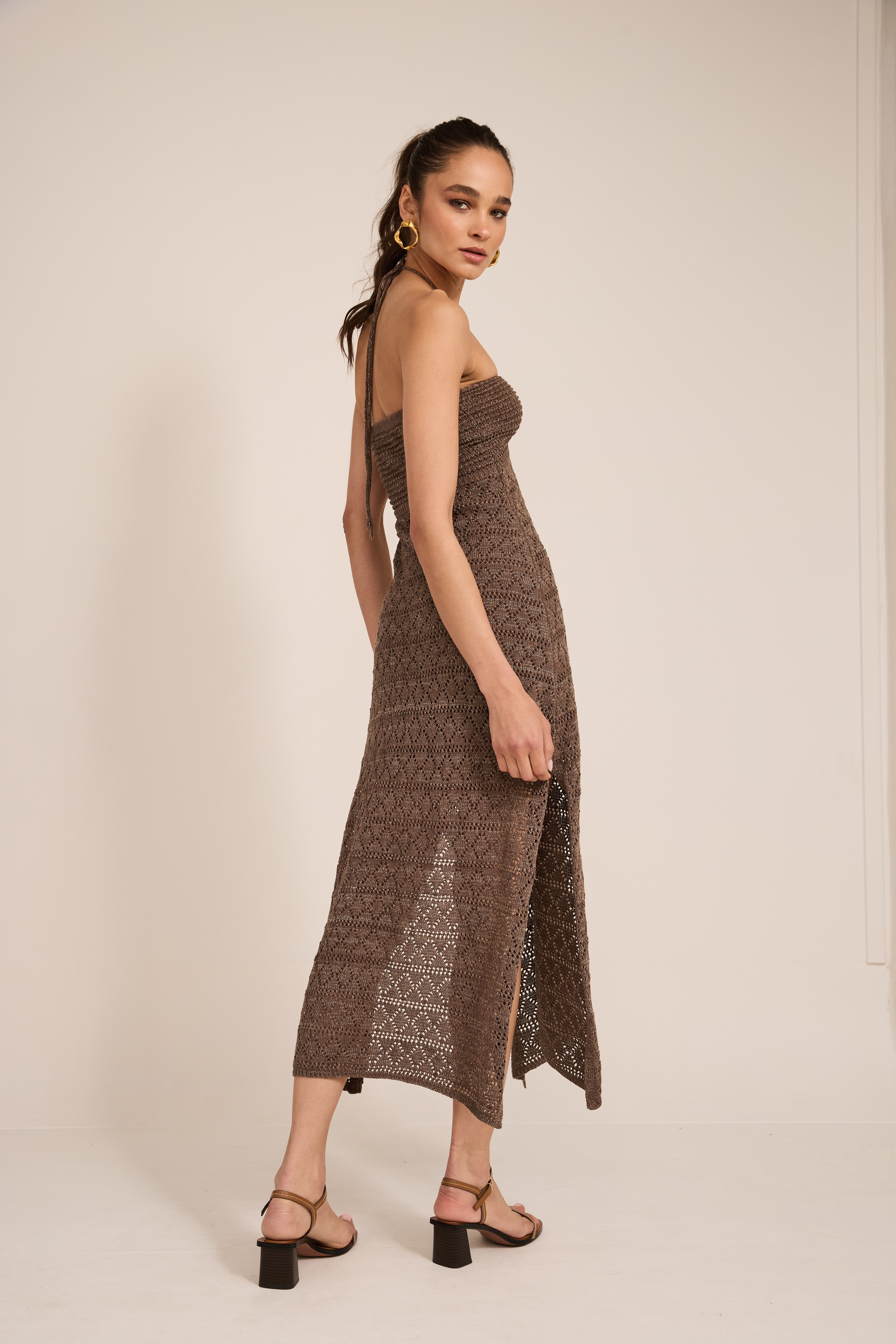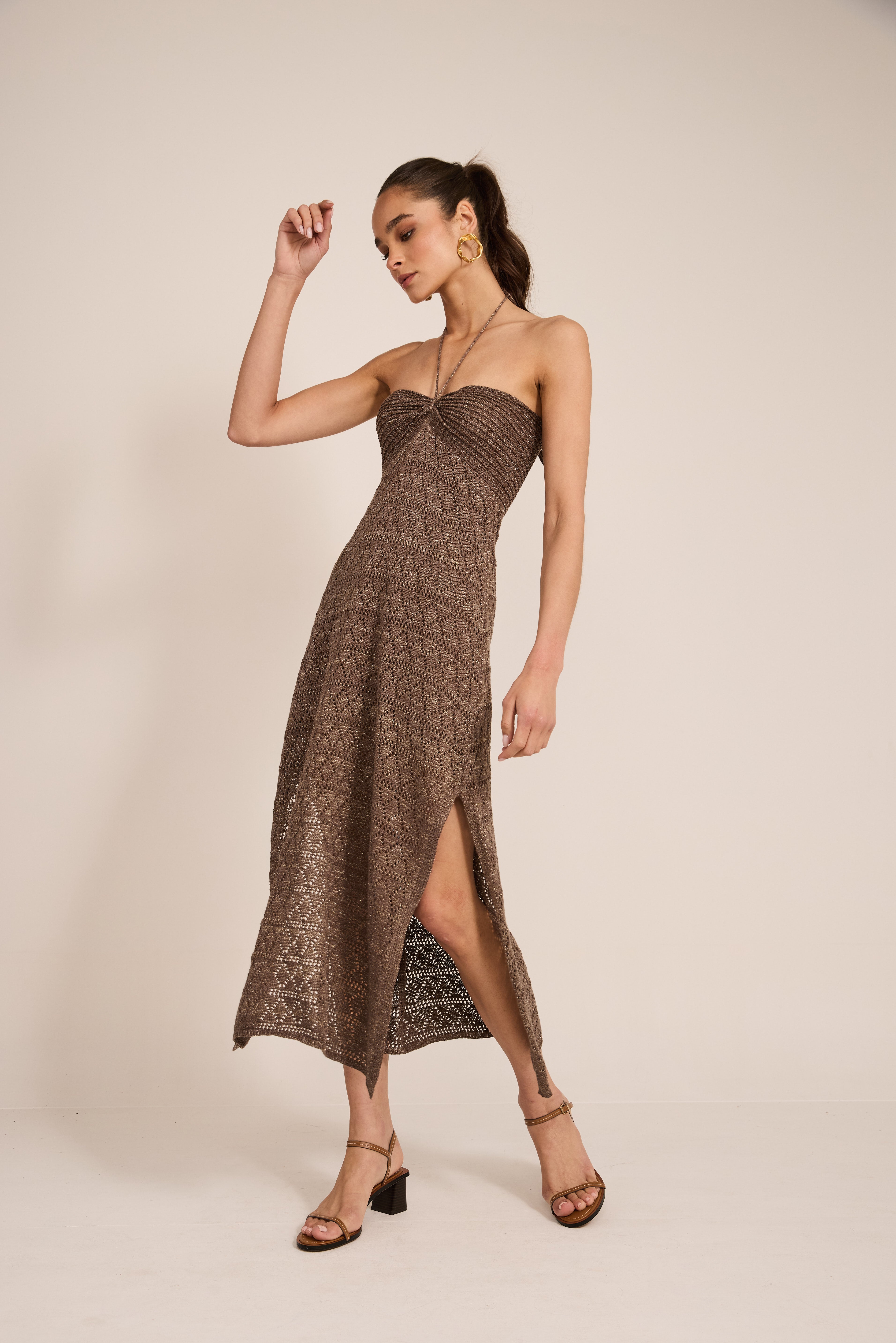 Escote strapless con fruncido al medio y tirantes delgados amarrados en el cuello.