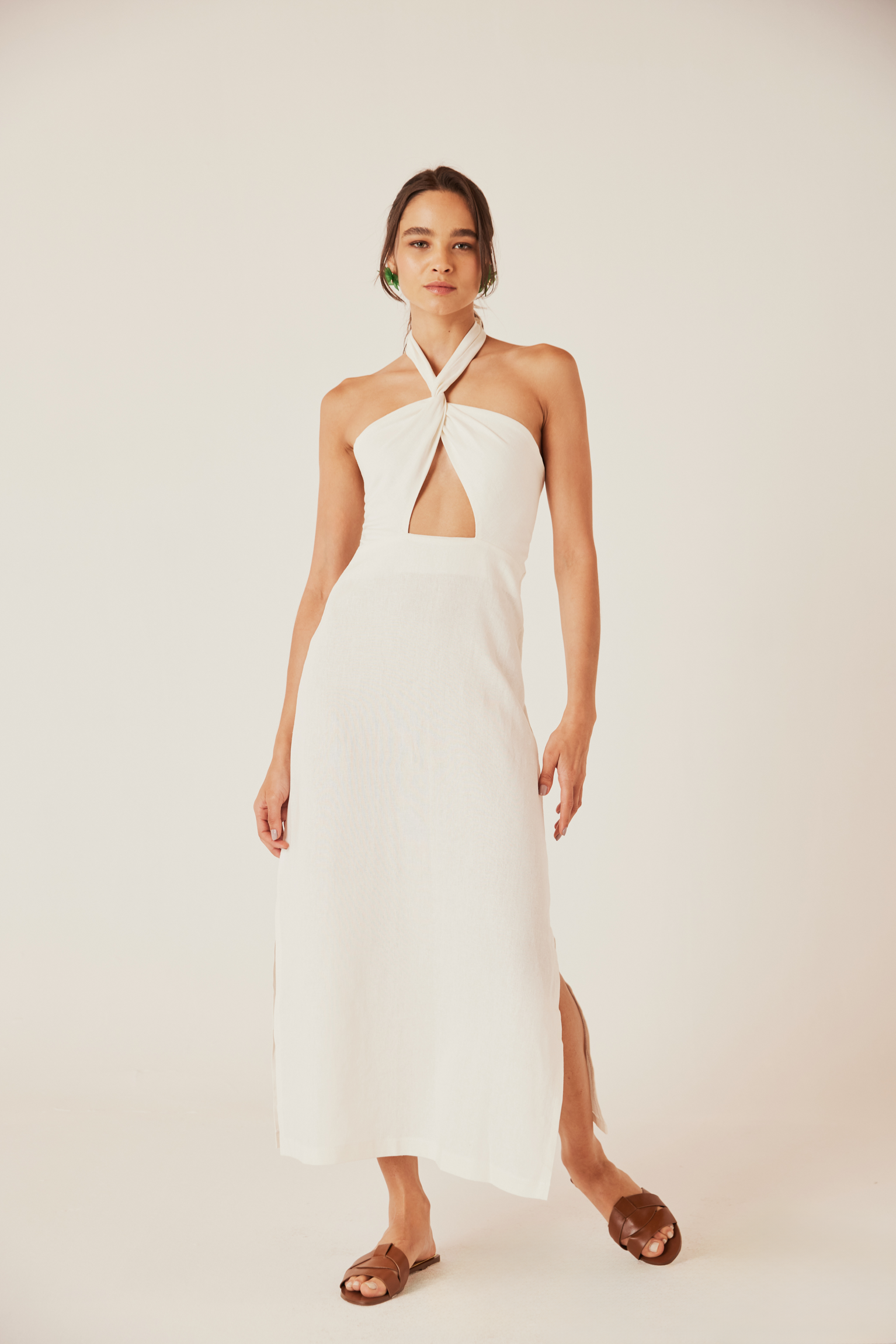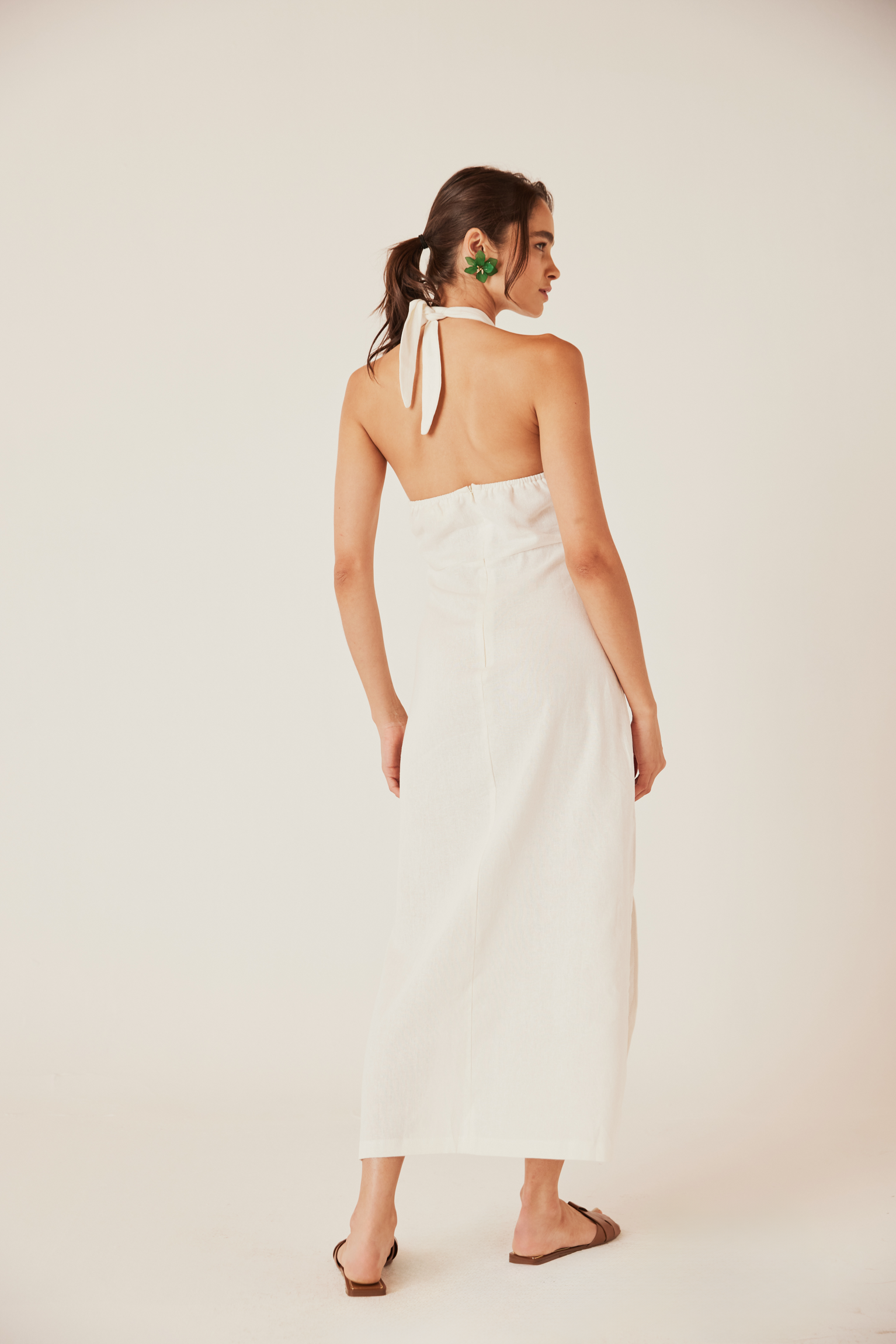 Vestido largo de lino con escote halter amarrado al cuello y abertura en el centro.